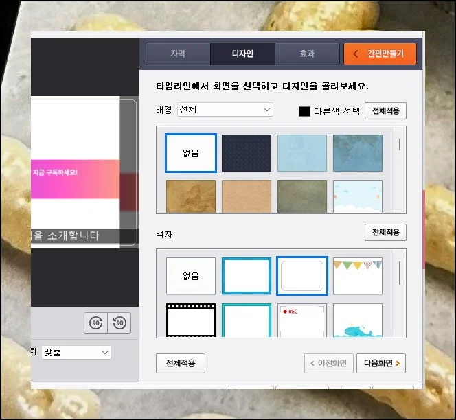 상세꾸미기 화면을 열면 다채로운 옵션이 나타납니다. 자막 삽입, 디자인 적용, 효과 추가 같은 버튼들이 대기하고 있어요.