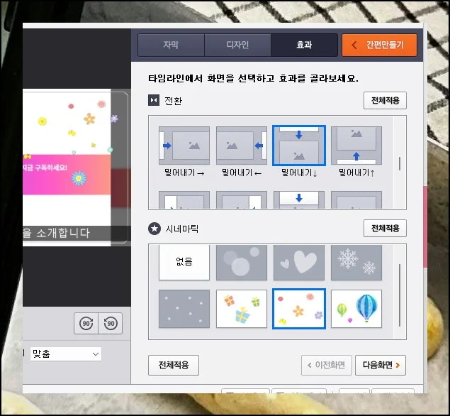 정지된 장면만 계속 보여주면 심심할 수 있어요. 장면 전환 효과를 구현하는 영상을 만드는 것이 생동감을 더 줄 수 있습니다.