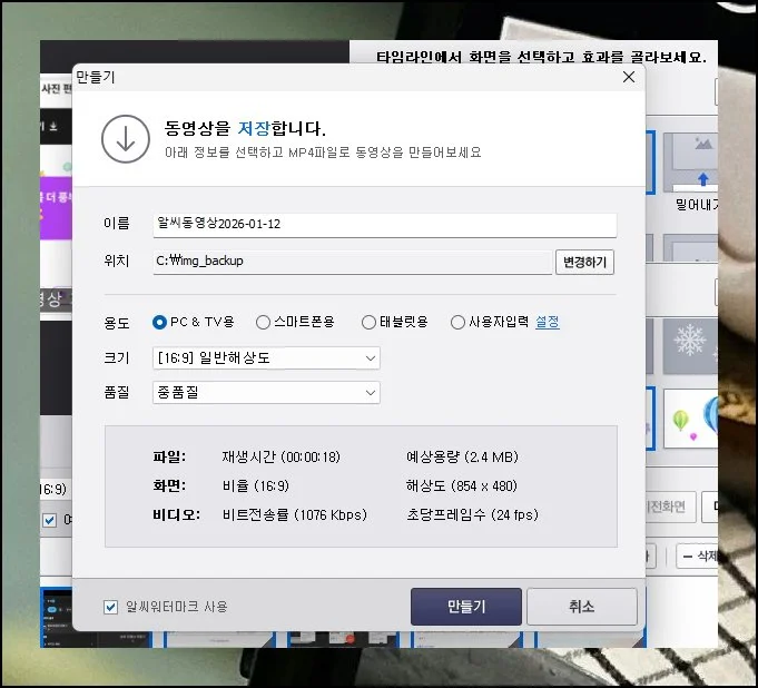 선택한 장치에 알맞은 형식으로 저장이 진행될 겁니다. 이런 식으로 사진 영상 컨텐츠 만드는 방법은 어렵지 않아요.