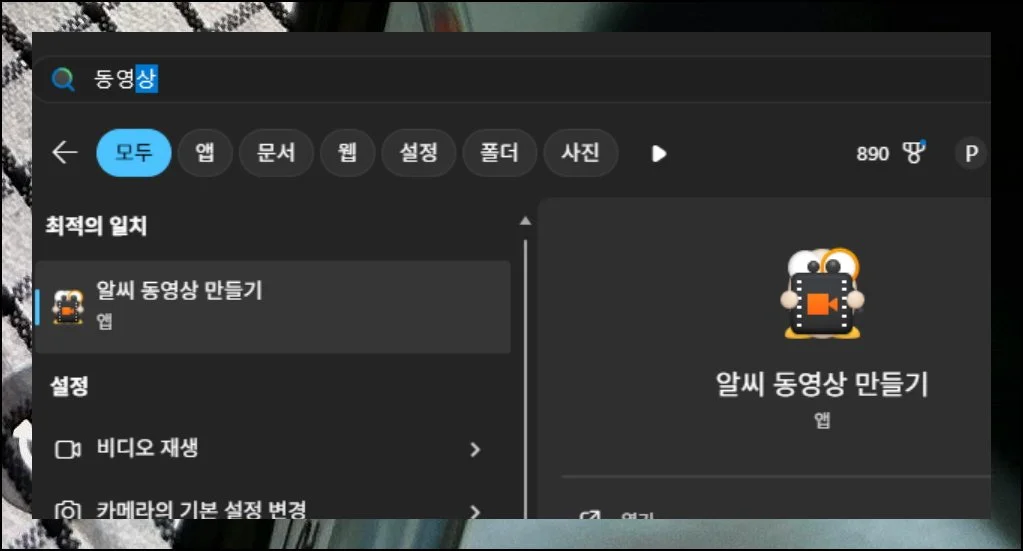 시작 버튼을 눌러보세요. 검색 영역에 “알씨 동영상 만들기”를 타이핑합니다.
