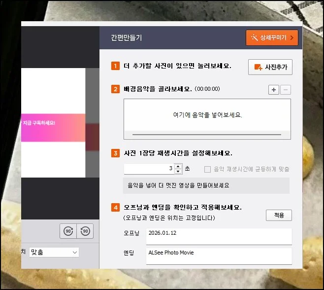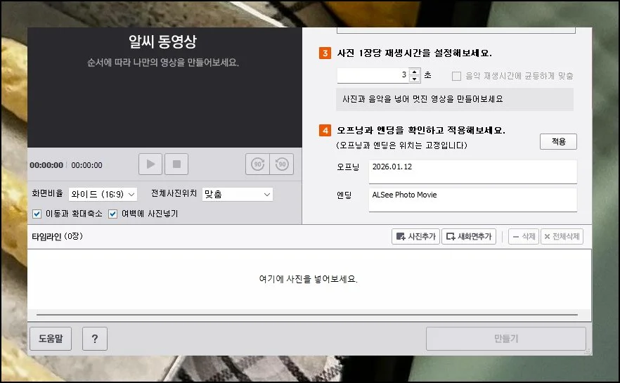 각 장면이 화면에 머무를 시간도 설정합니다. 오프닝이나 엔딩에 표시할 문구도 입력 가능해요.