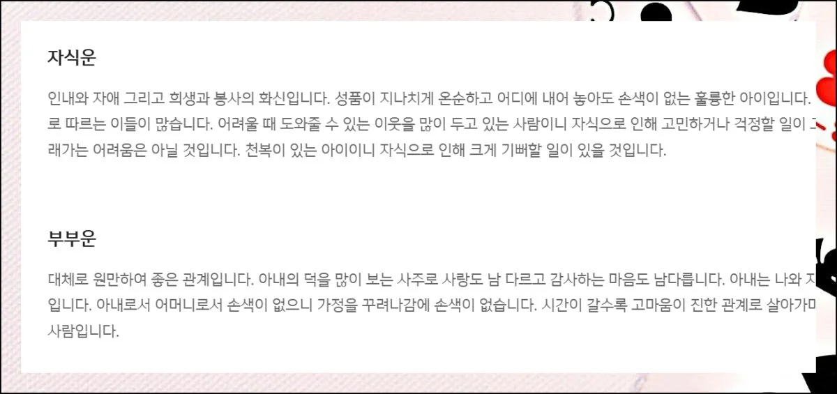 가족은 행복의 근간이 됩니다. 자녀운과 부부운으로 가족 관계를 점검해볼 수 있어요.