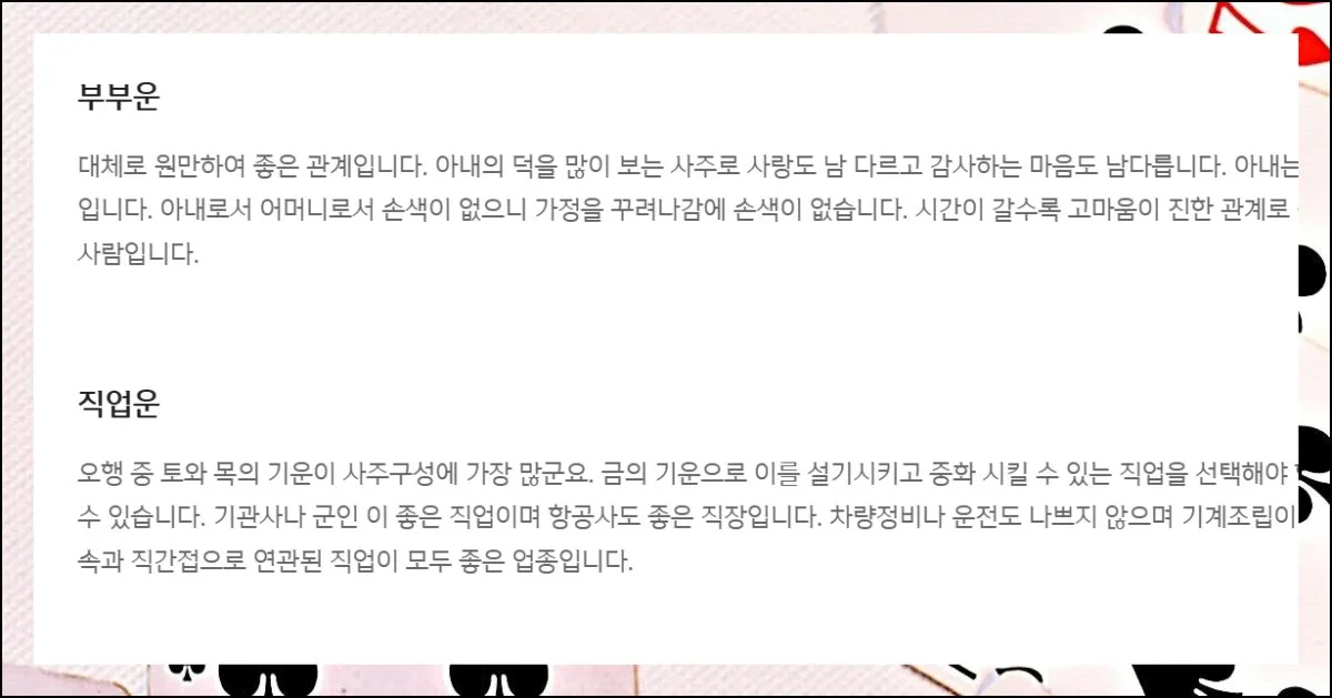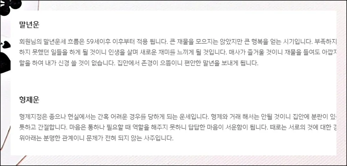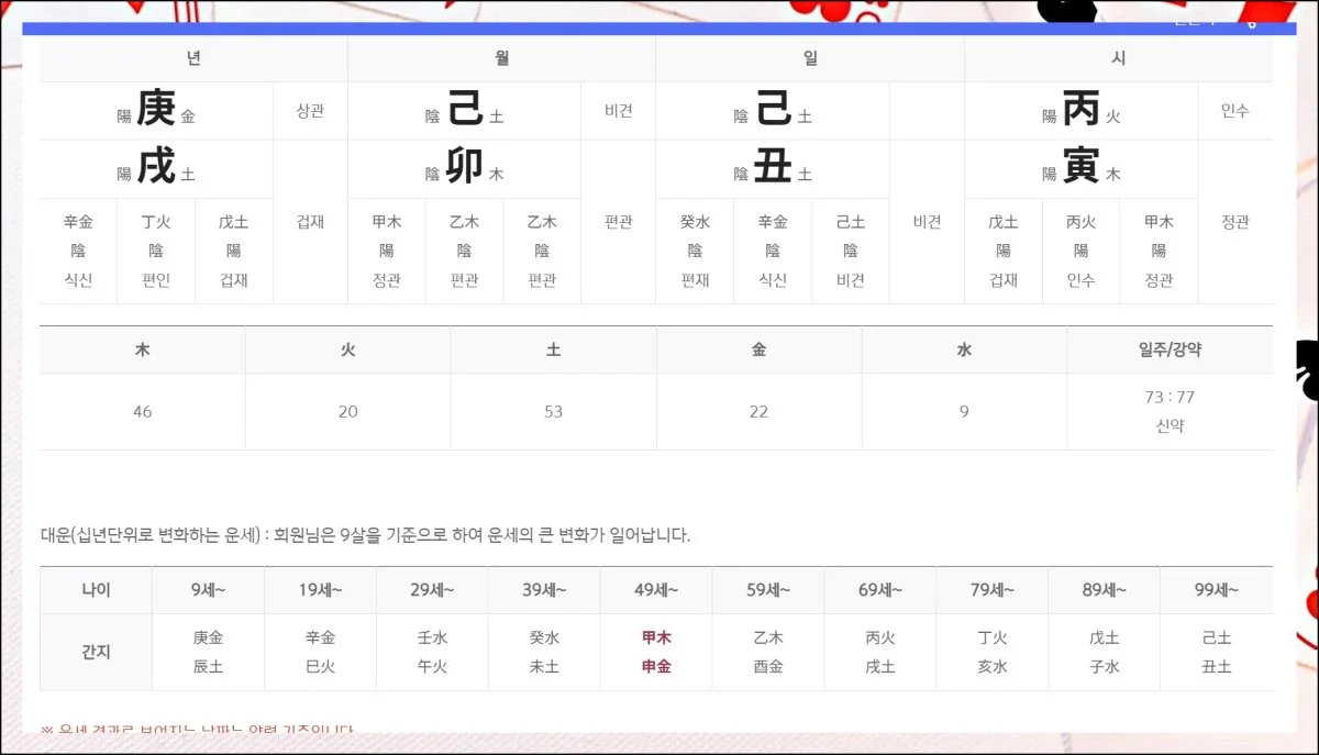 초년부터 말년까지의 전체 흐름을 우선 체크하는 것이 좋아요. 이후 하단에 제공되는 상세 설명들을 천천히 읽어보시면 됩니다.