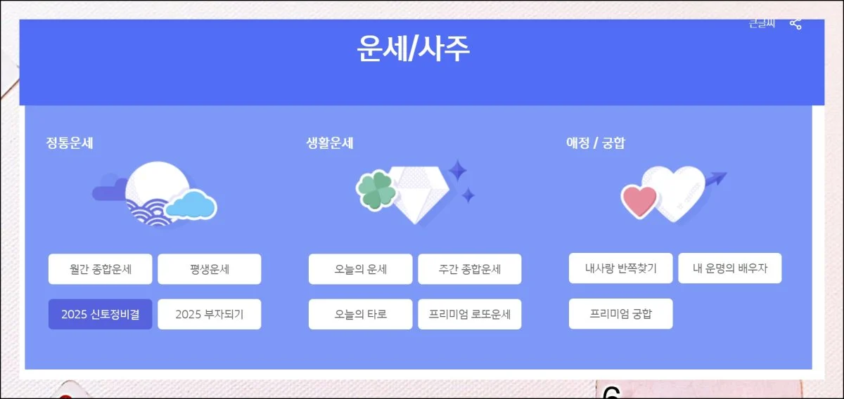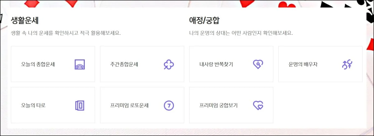 다양한 종류의 메뉴가 마련되어 있습니다. 궁합부터 꿈해몽까지 폭넓은 항목을 제공해요.