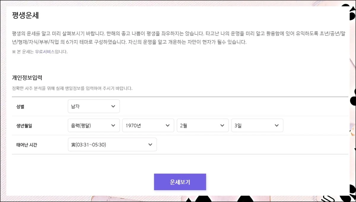 평생운은 처음 접하는 분들에게 적합한 서비스입니다. 정확한 분석을 위해서는 개인 데이터를 정확히 기입해야 합니다.