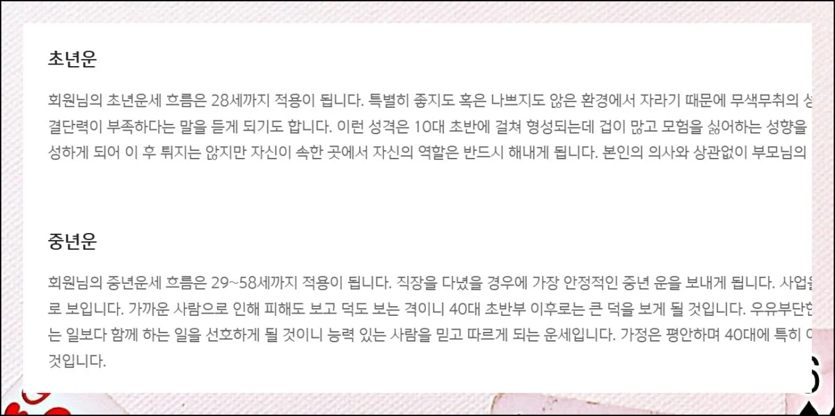 나이에 따른 무료운세를 구체적으로 나눠서 보여줍니다. 보통 0세부터 28세까지는 초년운에 해당합니다.
