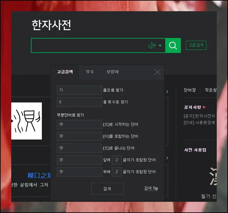 고급 검색 메뉴에 들어가면 다양한 도구를 만날 수 있어요. 부수별 검색, 모양별 검색 등 여러 방식이 준비되어 있는데요.