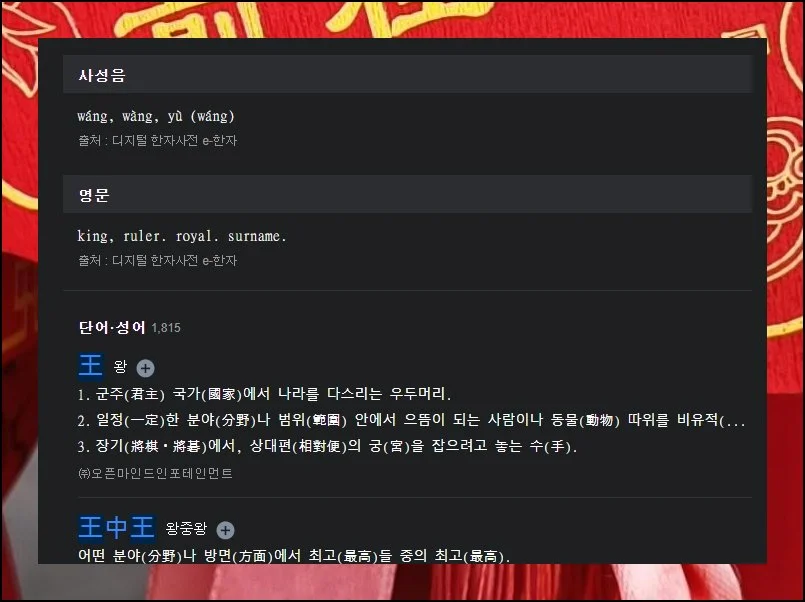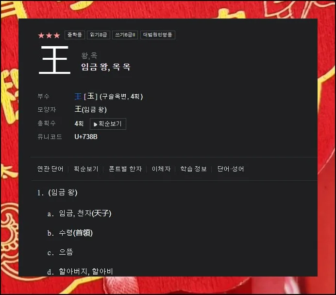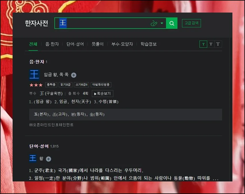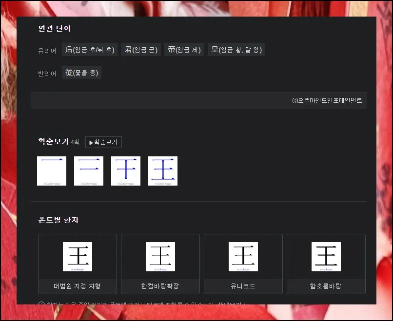 종이 옥편보다 훨씬 많은 정보를 검색할 수 있죠. 예를 들어 “임금 왕”자를 한번 찾아볼게요.