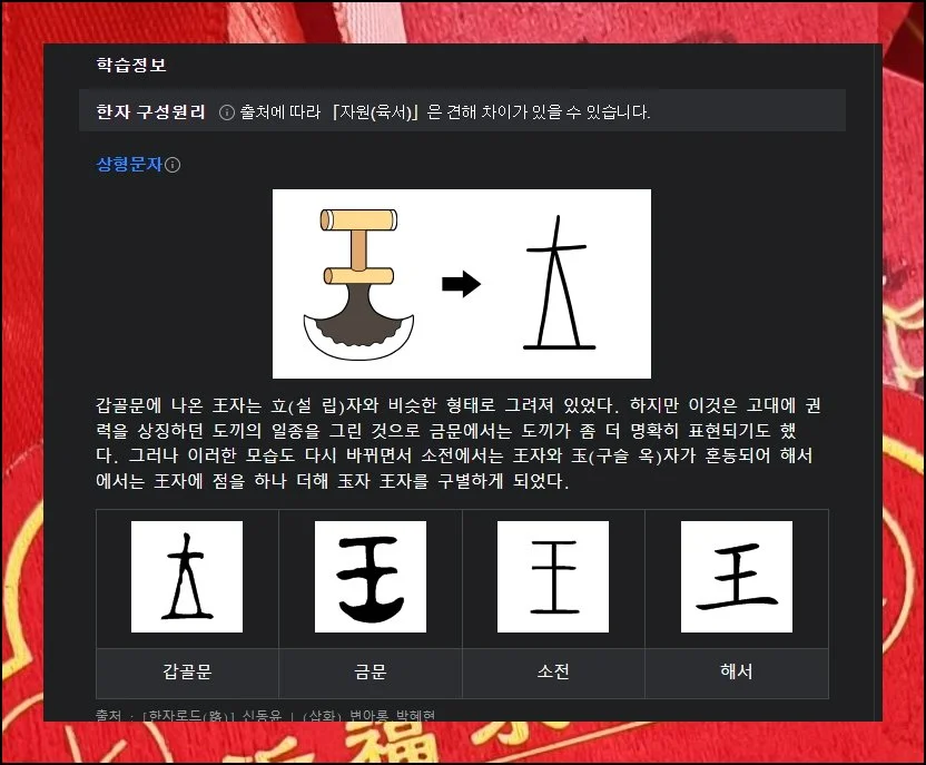 네이버의 옥편 서비스는 한자에 얽힌 재미있는 이야기도 들려줍니다. 임금 왕자가 도끼 모양에서 유래했다는 걸 아시나요.
