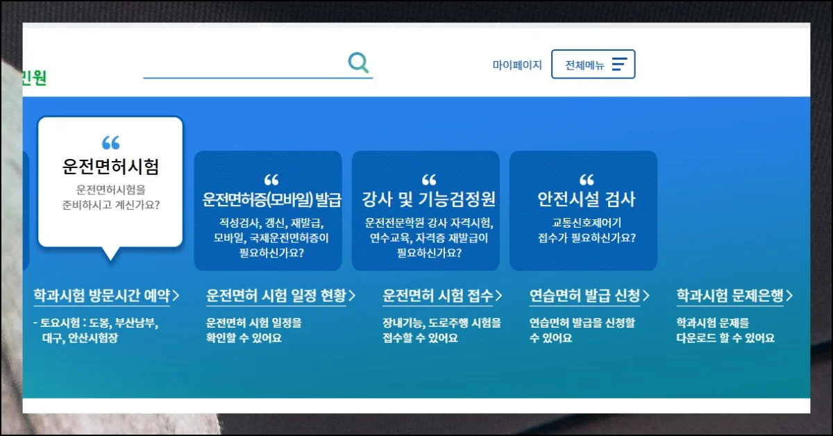 홈페이지에 들어가면 5개의 대분류 메뉴가 화면에 나타나는데요. 이 중에서 두 번째에 자리한 운전면허시험 항목을 선택하시면 됩니다.