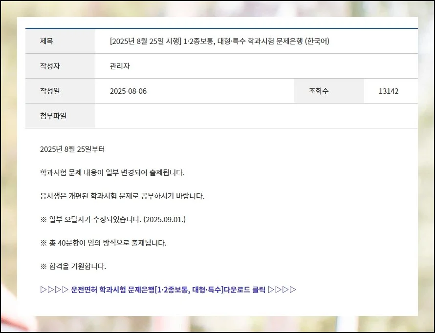 비문해자나 청각장애인을 배려한 맞춤형 프로그램도 함께 제공하니 필요시 활용하세요. 1종이나 2종 면허를 준비 중이시라면 4번 게시물을 통해 문제집을 받을 수 있어요.