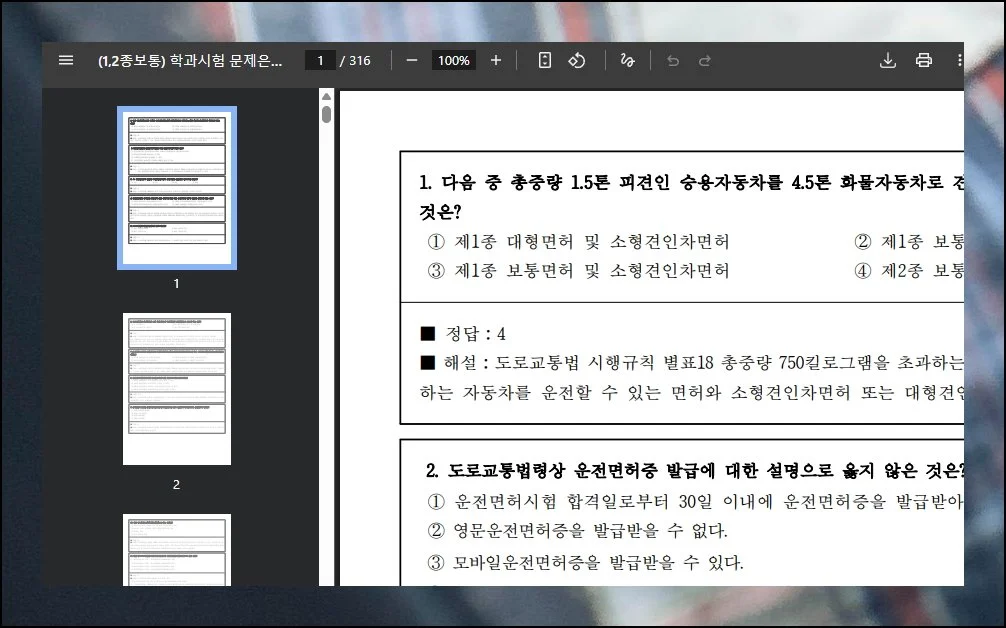 1종과 2종 외에도 대형이나 특수면허 취득을 목표로 하는 분들도 사용할 수 있는 문제집 자료에요. 학과시험의 경우에는 같은 범위의 내용을 다루기 때문에 그런 것 같습니다.