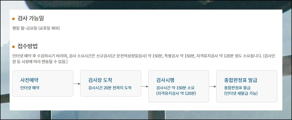 예약은 온라인으로 미리 완료하는 게 좋아요. 당일에는 약속 시간보다 최소 20분은 일찍 도착해야 해요. 시간을 지키지 않으면 운전정밀검사 테스트를 받지 못할 수 있으니 주의하세요.