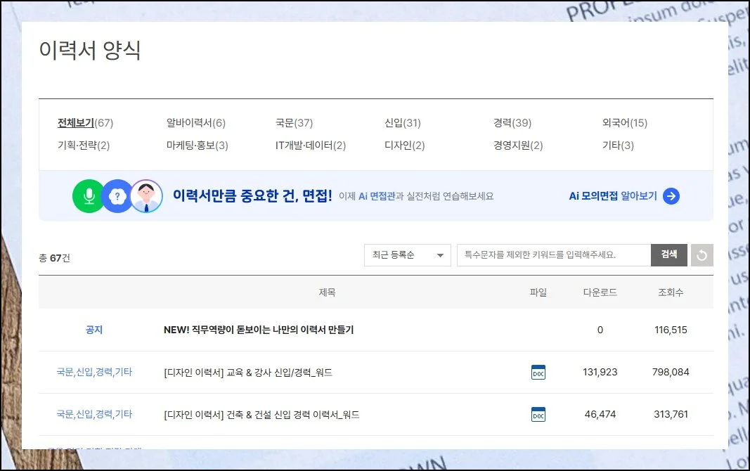 취업 자료 메뉴 내부에서 이력서 양식 카테고리를 발견할 수 있어요.