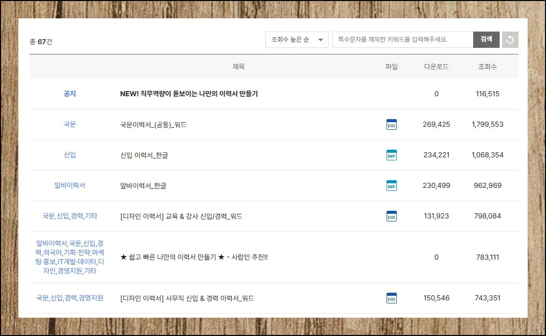 조회수와 다운로드 횟수가 훌륭한 지표가 됩니다. 파일 형식은 DOC, HWP, XLS 가운데 익숙한 것으로 선택하면 돼요.
