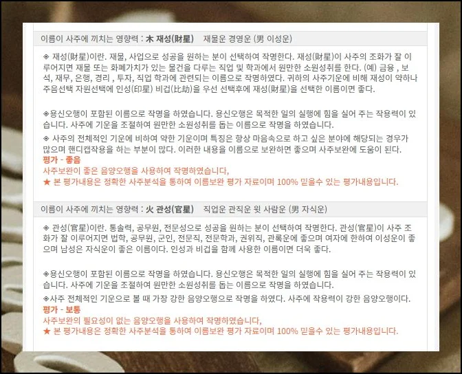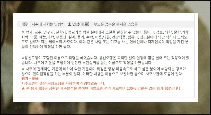 그런데 사주닷컴은 접근 방식이 달라요. 비용을 지불하지 않아도 수준 높은 이름풀이를 받아볼 수 있거든요. 정보의 깊이도 상당히 자세한 편입니다.