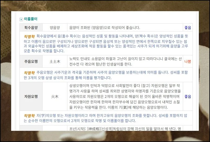 작명 관련 사이트 대부분은 이름을 구성하는 한자에 대한 기본 풀이만 제공하는 편이에요. 더 심층적인 분석을 받으려면 유료 서비스로 넘어가야 하는 경우가 많죠.