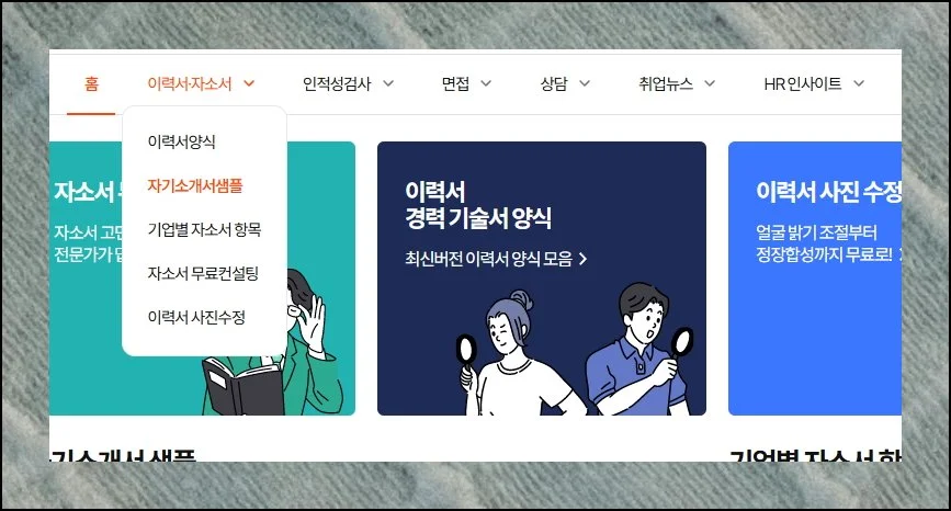 메뉴에서 자기소개서 샘플 항목을 누르면 실제 합격자들의 제출 서류를 열람할 수 있어요. 이런 성공 사례를 모은 곳이라 배울 점이 많죠.