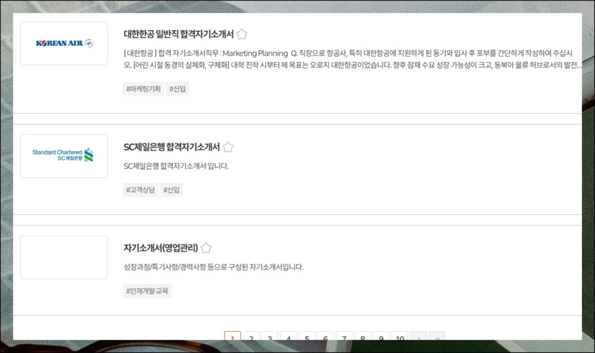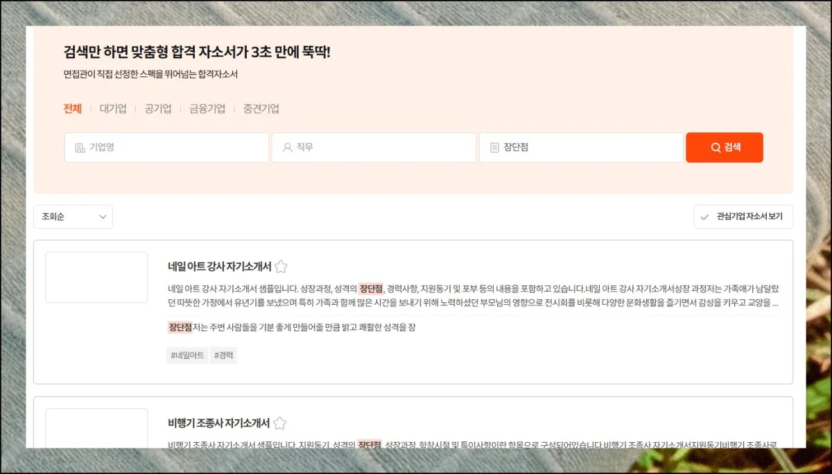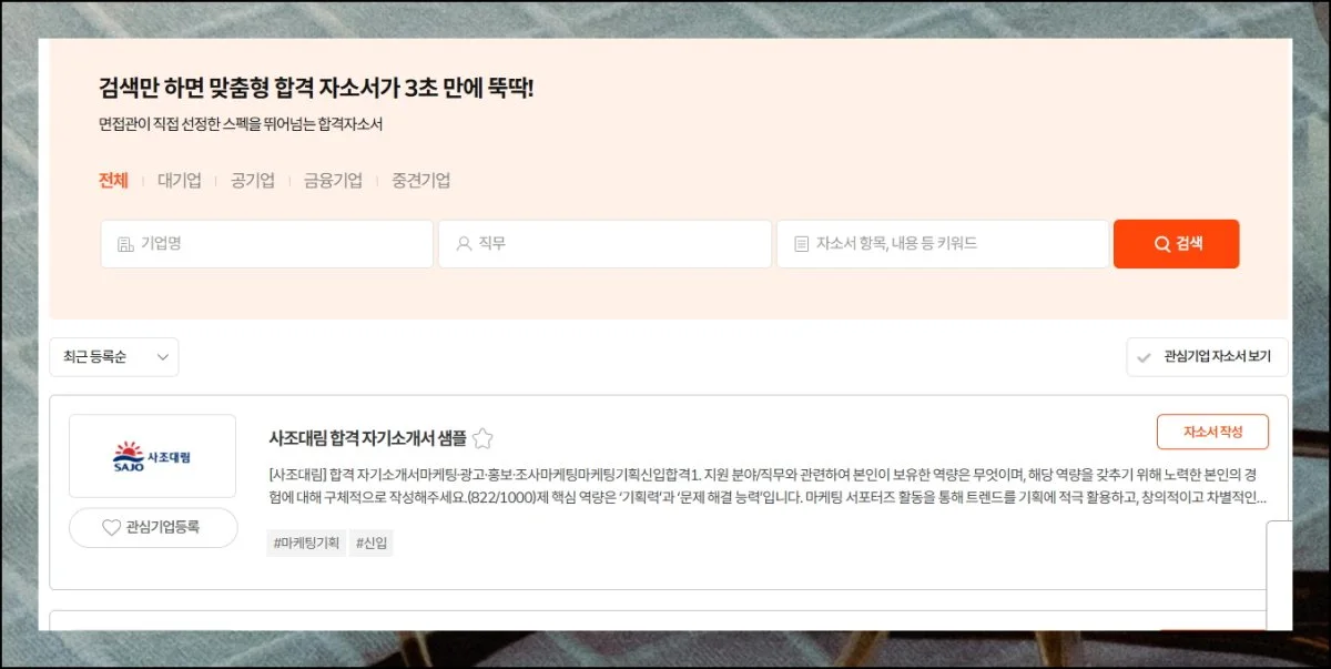 대기업 50위권이나 매출 상위 1000개 회사의 합격 예시도 간편하게 접근할 수 있어요. 특정 키워드로 찾으면 연관된 자료들이 목록으로 나타나죠.
