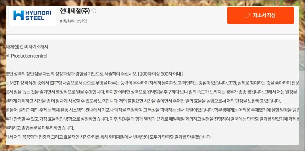 현대제철 합격자의 자기소개서를 살펴보면 성격의 강점과 약점, 자라온 환경 등 전형적인 질문이 포함되어 있어요.