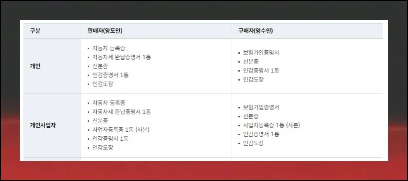 판매자 쪽은 대부분 사업자인 경우가 많아요. 개인이 직접 판매하는 상황이라면 차량등록증이 가장 중요한 문서예요. 세금 완납증명서도 준비하셔야 하고요.