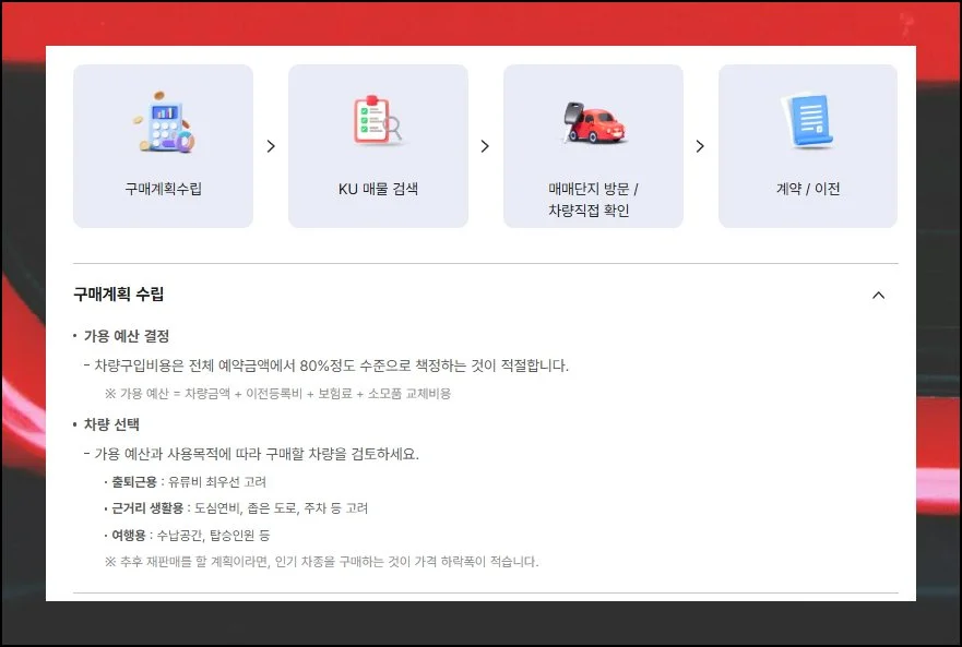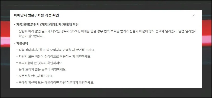 자동차 매매시 서류를 준비하는 것처럼 차량 선택도 신경 써야 할 부분입니다. 사이트에서는 반드시 확인해야 할 항목들을 단계별로 안내해줍니다.