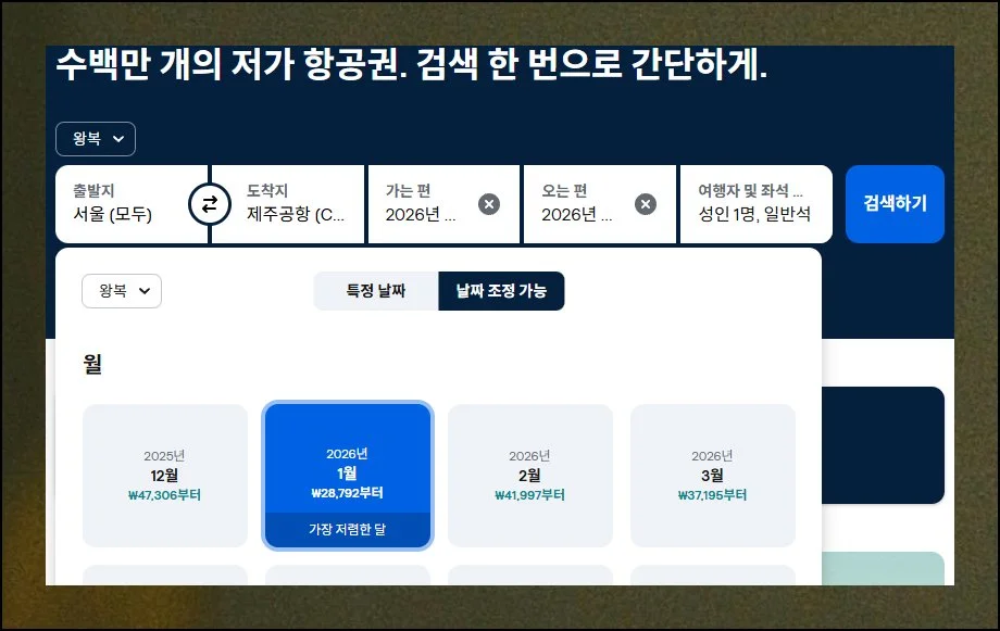 우선 도착지를 제주 공항으로 지정하세요. 그리고 출발일과 귀국일을 한 달 전체로 설정합니다. 이렇게 하면 그 달에서 가장 저렴한 비행기표를 골라 예약할 수 있어요.