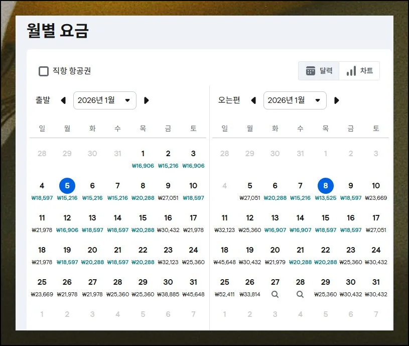 설정을 마치면 날짜별로 최저가 항공권이 화면에 뜹니다. 이 중에서 마음에 드는 날짜를 고르면 돼요.