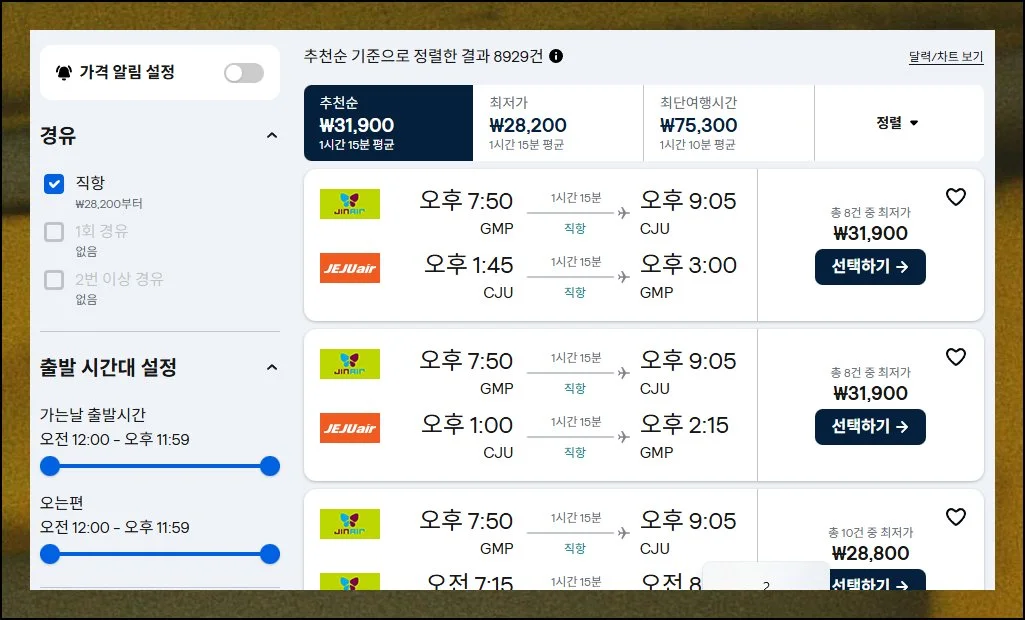 시간대가 불편하다면 왼쪽 출발 시간 필터를 활용해 보세요. 원하는 시간대를 지정한 뒤 최저가 정렬을 적용하면 됩니다.