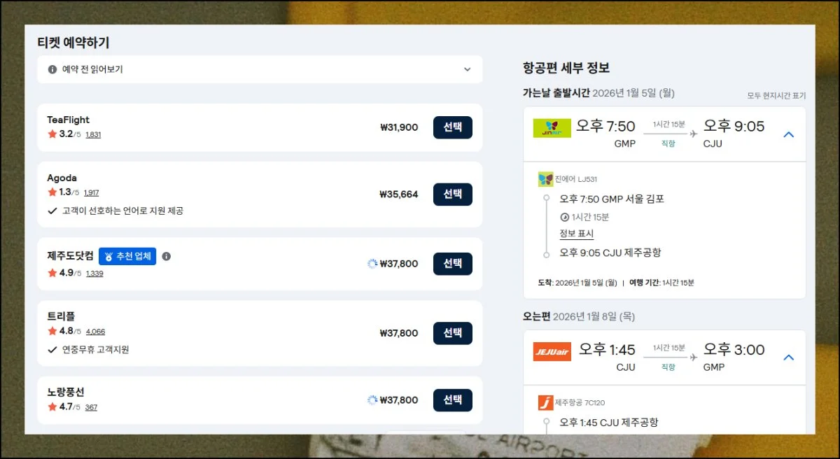 원하는 항공편을 골랐다면 이제 어디서 예약할지 정해야 해요. 여행사나 사이트 중에서 평점도 좋고 비용도 합리적인 곳을 선택하시면 됩니다.