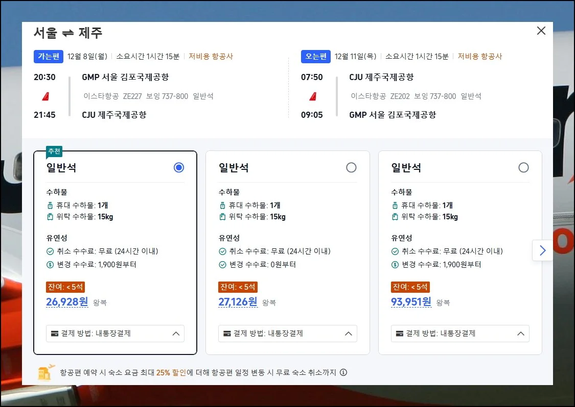 검색 결과로 나온 제주 저가항공권 금액은 27,725원이에요. 이스타젯에서 제공하는 상품이네요.