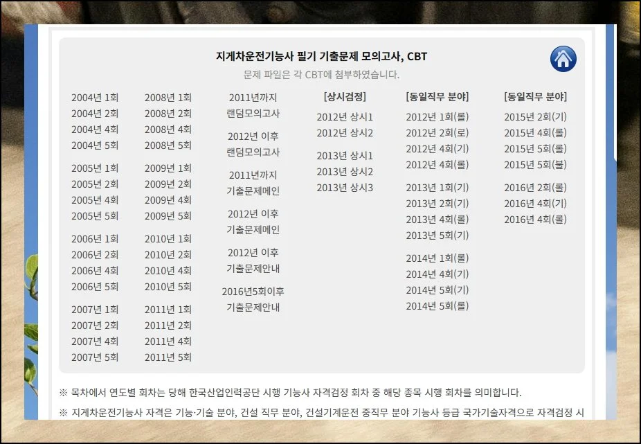 과거 시험 자료들이 연도와 회차로 체계적으로 분류되어 있을 거예요. 2004년부터 2016년 정도까지의 지게차 운전기능사 기출문제를 보관하고 있습니다.