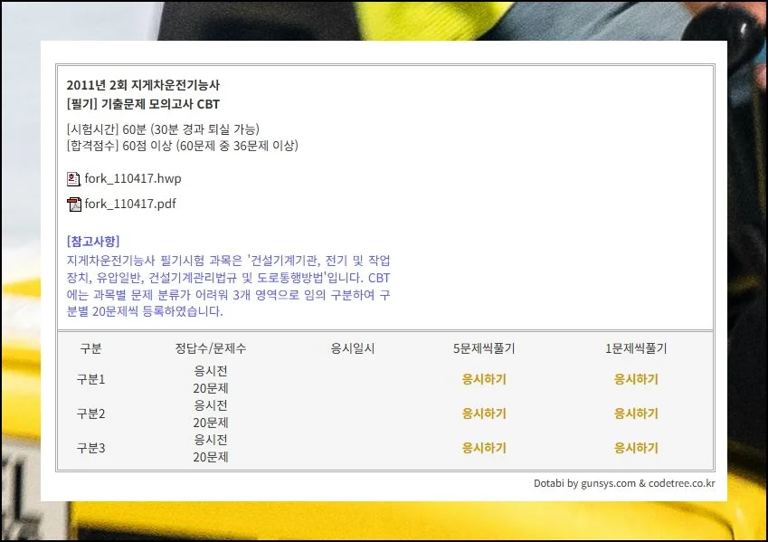 지게차 운전기능사 기출문제는 주로 두 가지 파일 형태로 준비되어 있어요. PDF와 HWP 파일 중에서 본인 컴퓨터에 설치된 프로그램에 적합한 것을 골라주세요.