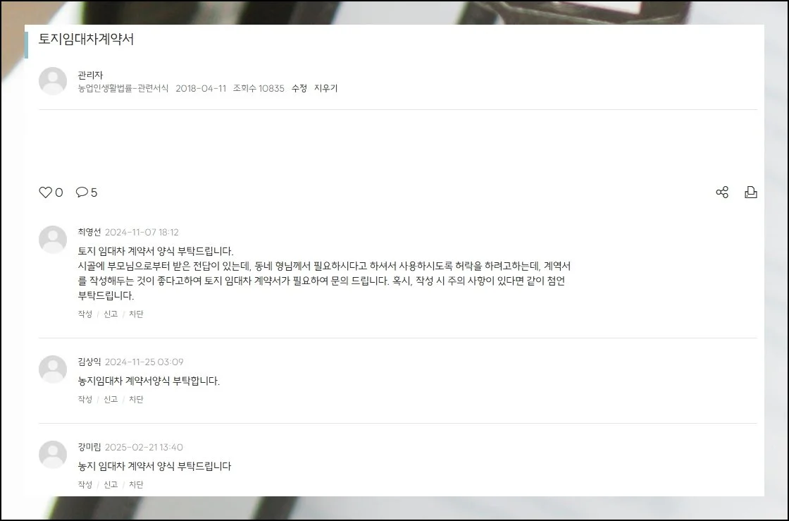 민원 센터에 있는 농업인 생활법률 코너로 들어가 보세요. 거기서 토지 임대차 계약서 관련 무료양식을 확인할 수 있어요. 법률적으로 어려운 사안이 생기면 국가법령정보센터를 병행해서 활용하시면 좋습니다.