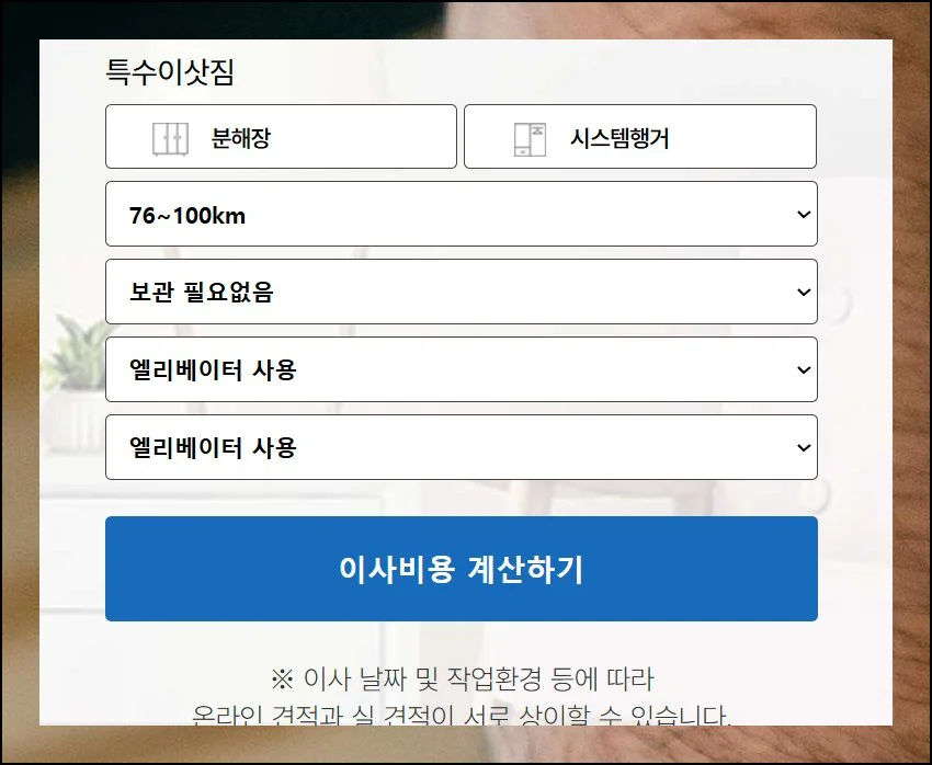 세부 조건을 정밀하게 입력할수록 나오는 결과의 정확성이 올라갑니다. 이사비용 계산하기 버튼을 눌러주세요.