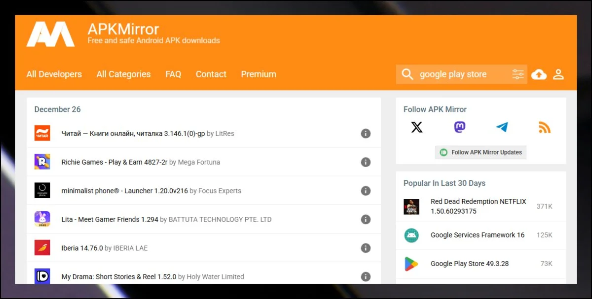 해외 사이트지만 플레이스토어 파일을 쉽게 받을 수 있는 곳을 소개해 드릴게요. APKMIRROR라는 곳인데요.
