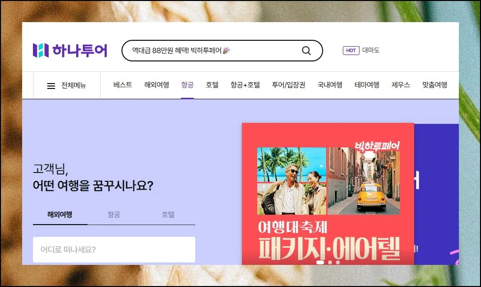 하나투어 공식 사이트에 접속해보세요. 여행사는 패키지만 취급한다고 생각하기 쉬운데요.