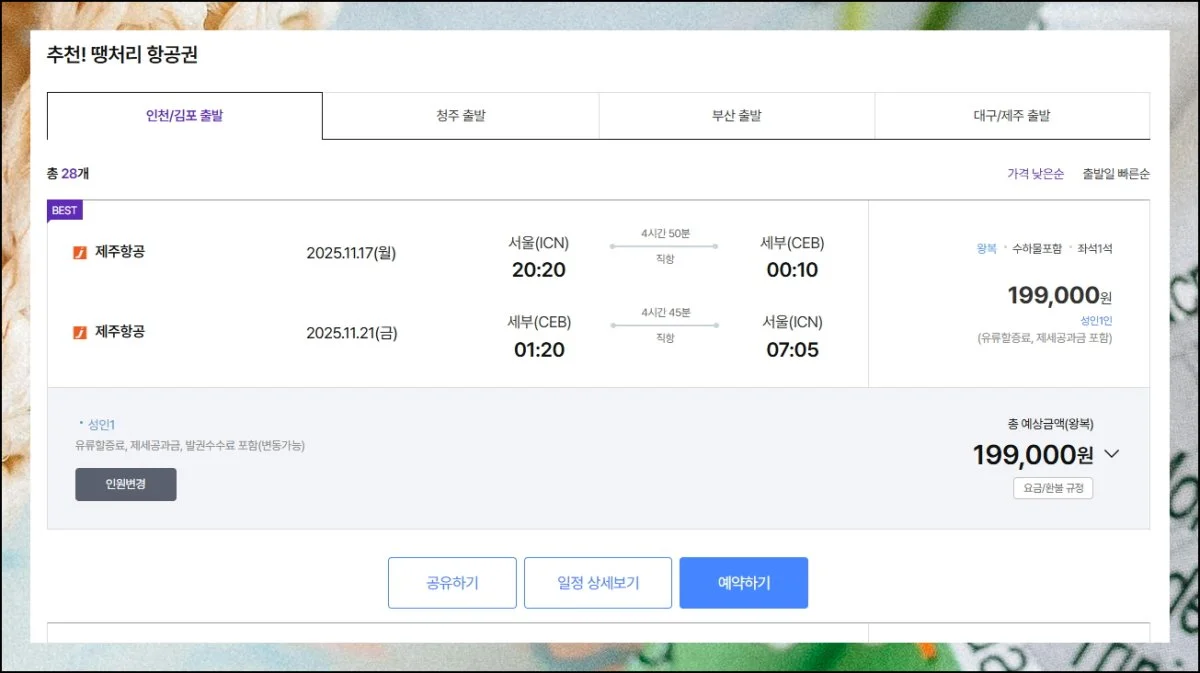 마음에 드는 땡처리 티켓을 발견했다면 출발 날짜와 시간, 총액을 다시 한번 꼼꼼히 살펴보세요.