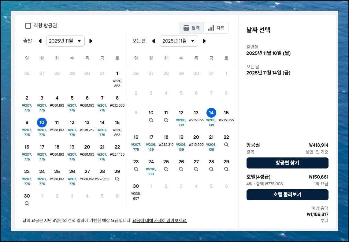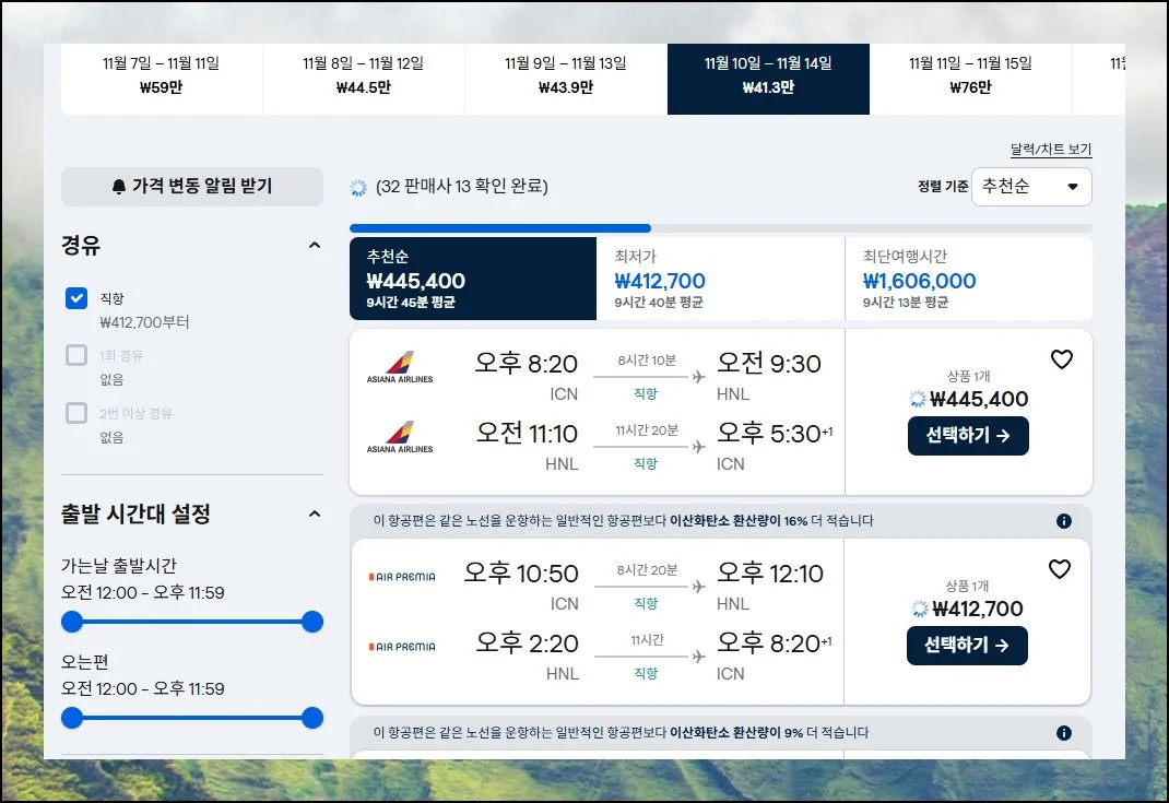 한국에서 하와이로 가는 직항편은 호놀룰루행이 주요 선택지입니다. 항공편 예약 사이트에 접속해서 출발일과 도착일을 한 달 범위로 설정해보세요.