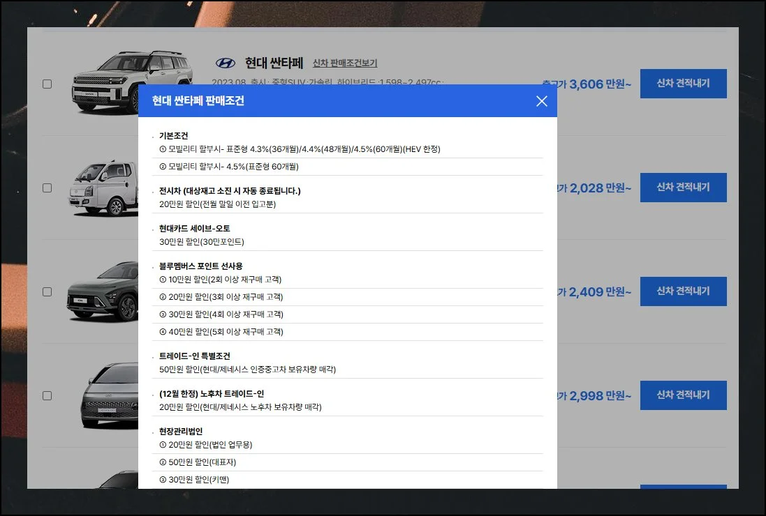 판매 조건 중에서 자신에게 해당하는 할인을 꼼꼼하게 살펴보세요. 현대차는 시기와 차종에 따라 다양한 할인을 진행하고 있습니다.