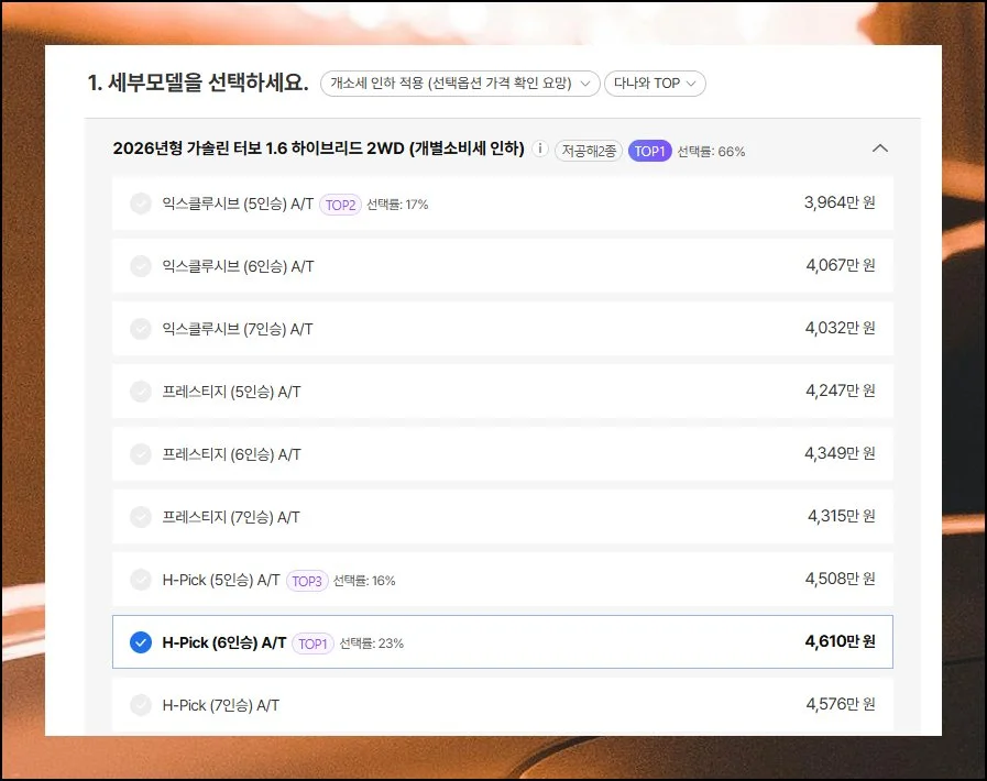 검색이 끝나면 차량 종류 리스트를 여러 방식으로 정렬할 수 있습니다. 출시일 기준이나 연비, 가격 순으로 재배열해서 비교해보세요.