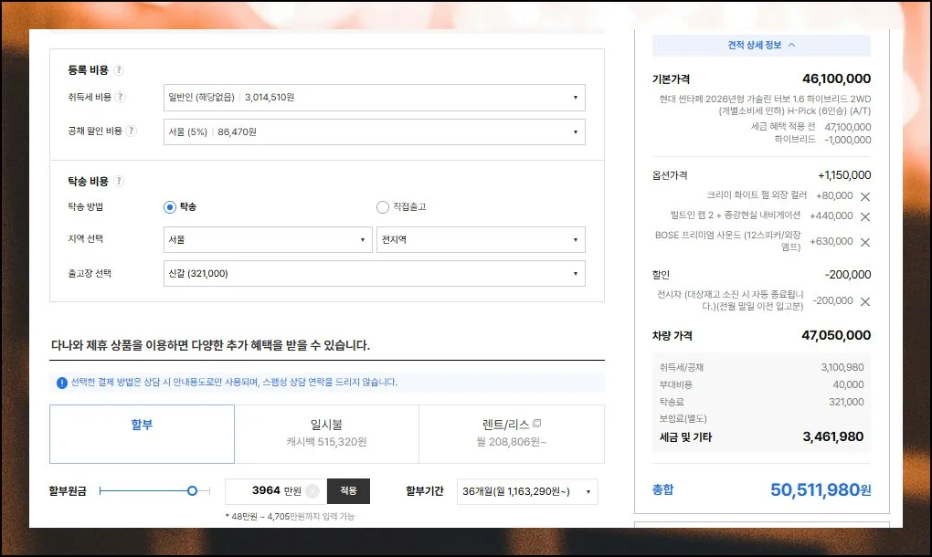 렌터카 이용이나 리스 계약 옵션도 함께 안내되고 있습니다.