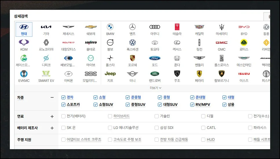 상세 검색 페이지에서 브랜드를 “현대차”로 설정하세요. 승용이나 RV 같은 차량 종류를 고르면 원하는 결과만 나옵니다.