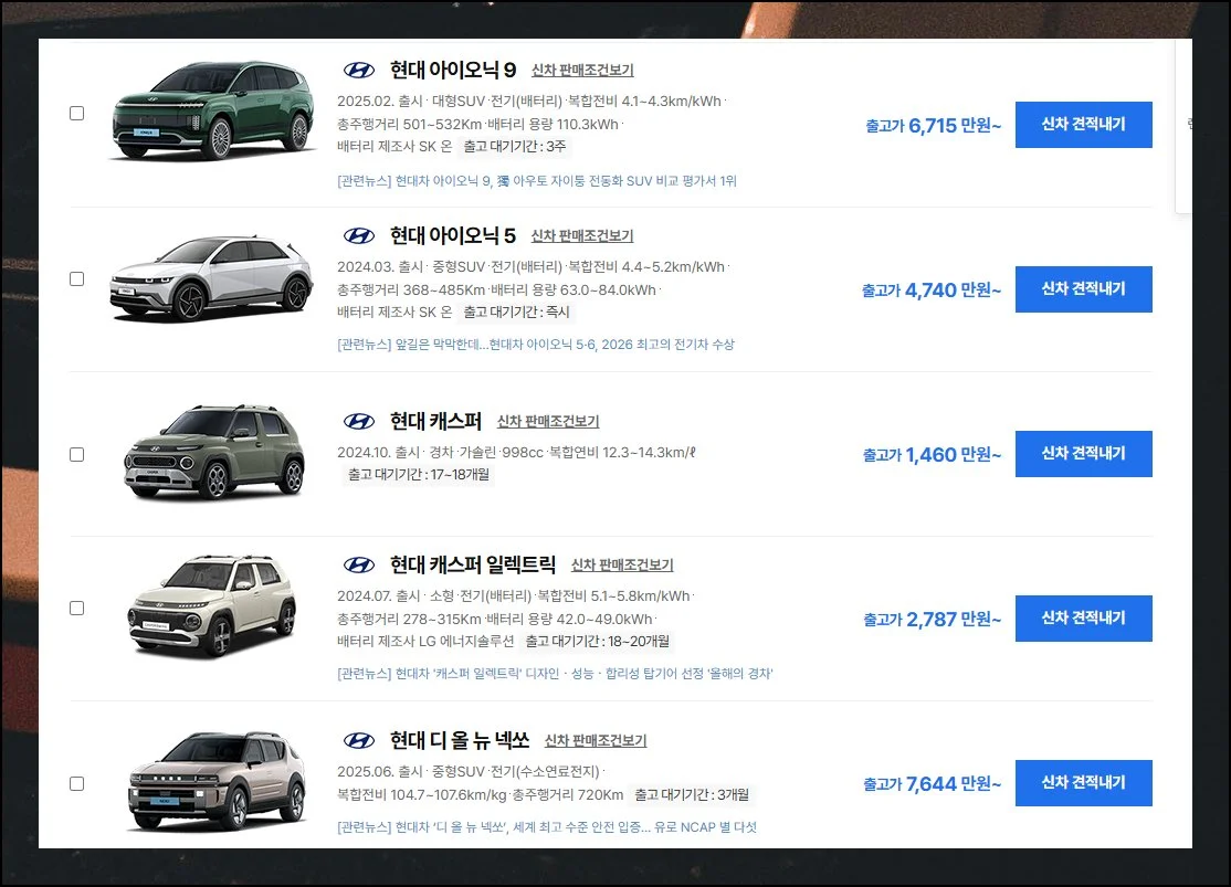 이렇게 선택지가 많다 보니 오히려 결정이 어려워지는 경우가 많습니다. 각 모델의 특징과 가격대를 꼼꼼히 비교해보면 자신에게 딱 맞는 차량을 찾을 수 있어요.