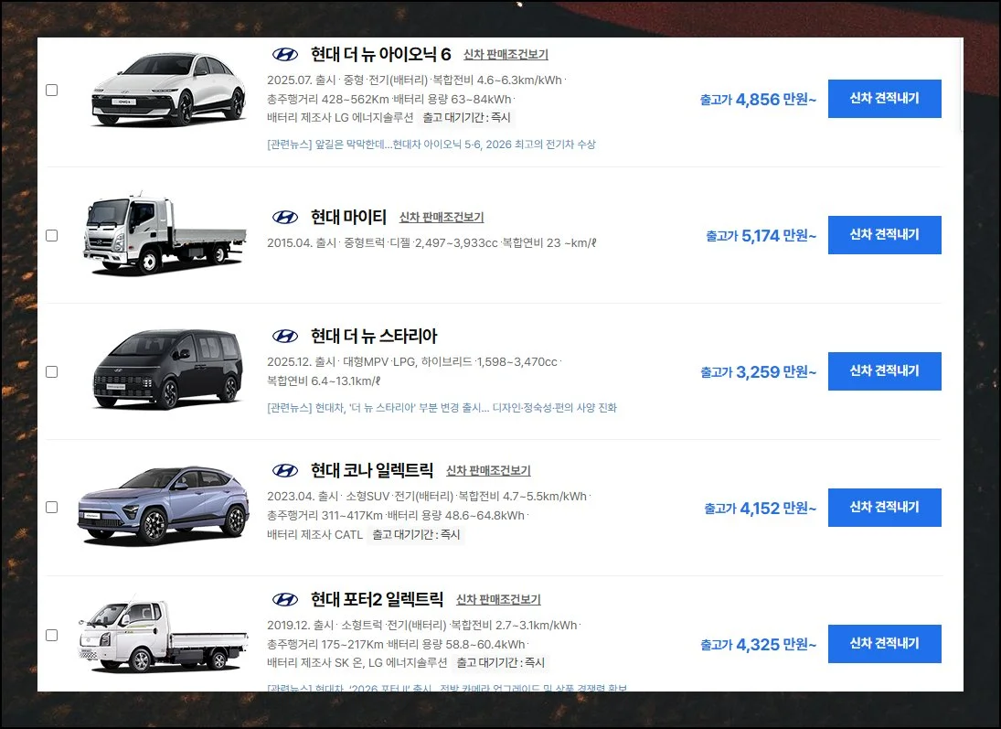 사이트에 들어가면 상단 메뉴에서 신차 검색을 찾아보세요. 여기서는 현대차의 최신 출시 모델 정보를 확인할 수 있어요.