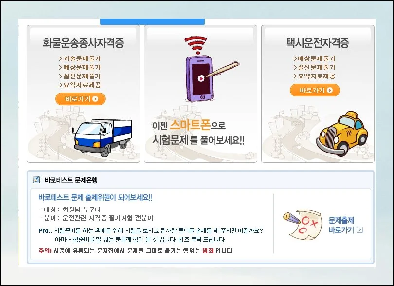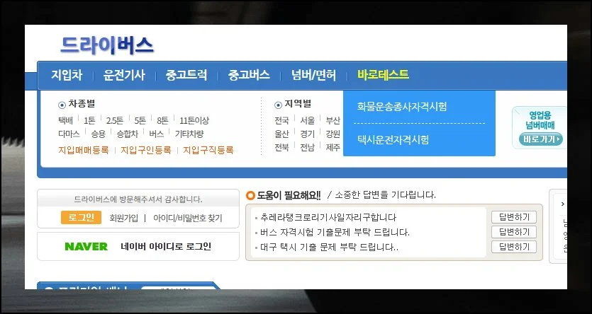 첫 화면에서 화물차 운전 채용 공고를 바로 확인할 수 있어서 시간이 절약돼요. 자격시험 기출문제 자료를 찾으려면 화면 오른쪽 상단에 있는 바로테스트 메뉴를 클릭하면 됩니다.