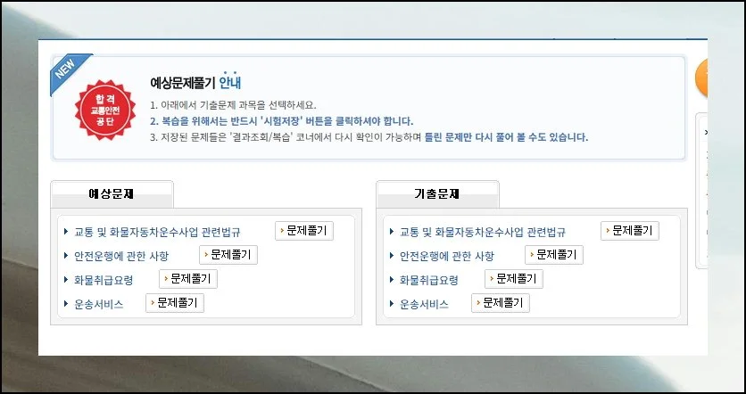 화물운송자격증 시험 대비용 기출문제들을 전부 무료로 활용할 수 있다는 게 가장 큰 매력이에요. 예상 문제와 실전 문제, 과거 출제됐던 기출 자료까지 여러 종류가 준비되어 있습니다.