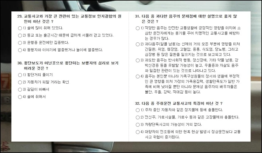 안전하게 운행하는 내용과 교통법규 및 운수 관련 법령도 출제되고요. 전체 과목을 고르게 연습한 뒤에 약한 영역만 집중적으로 보완하는 학습 방법을 추천합니다.