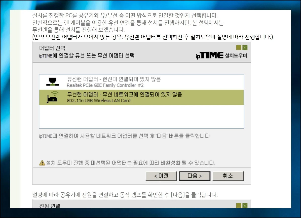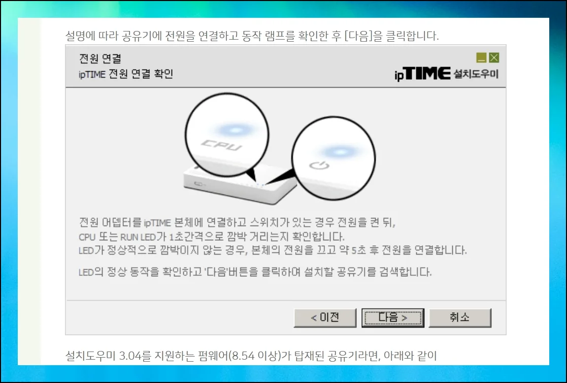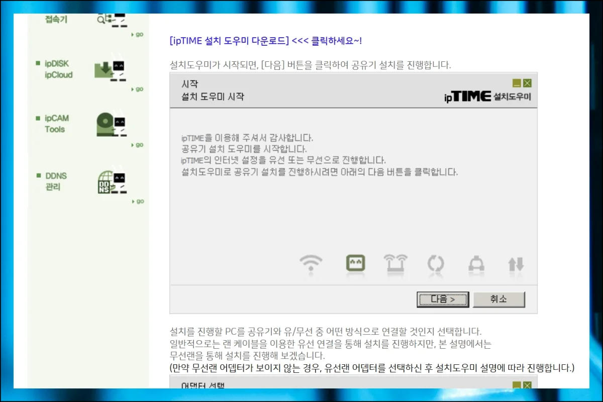 IPTIME 설치도우미를 열면 화면에 친절한 안내가 나타나니 순서대로 따라가기만 하면 돼요.