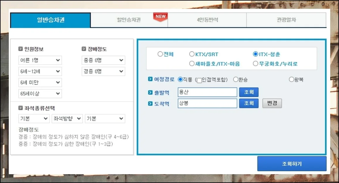 처음 시도하는 분이라도 복잡하지 않으니 천천히 따라 해보세요. 탑승 인원과 좌석 유형, 이용 날짜를 정한 뒤 열차를 골라 조회 버튼을 누르면 됩니다.